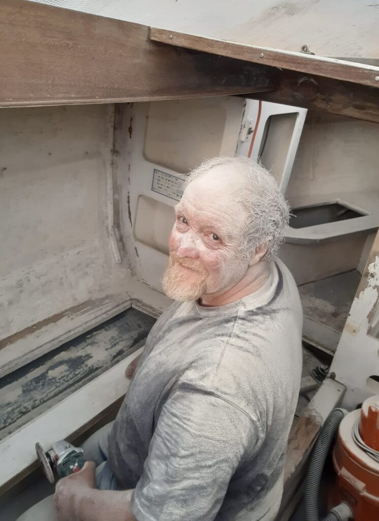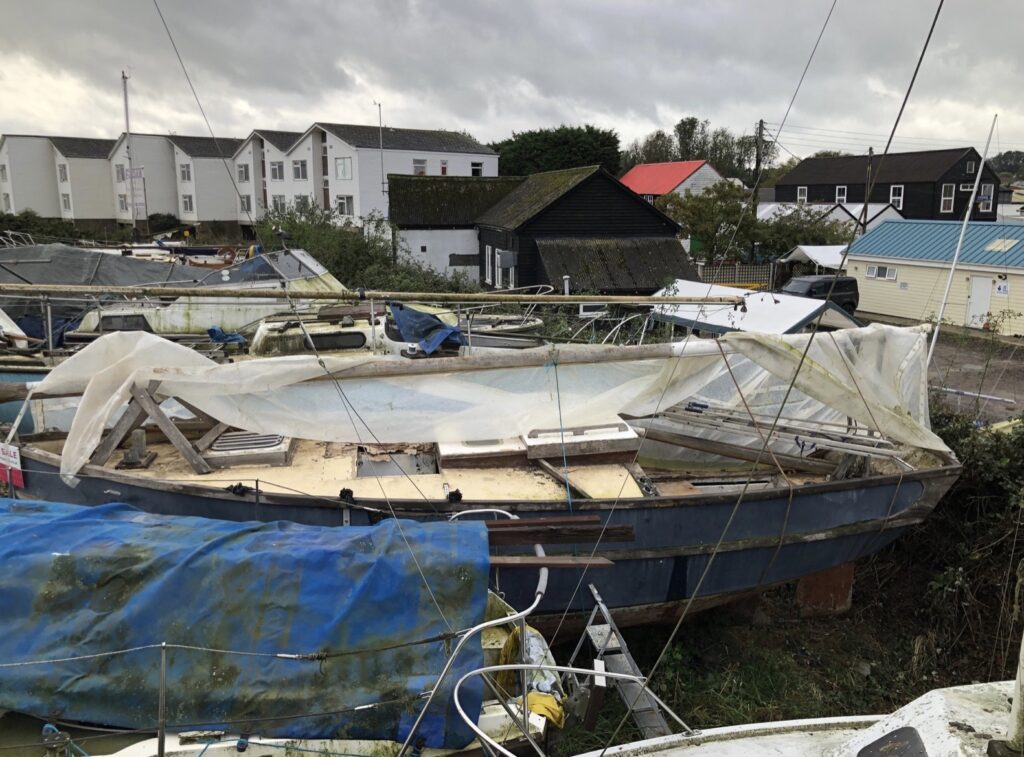 Yvonne and I first saw ‘Gilda’ in October 2023, behind many boats in the TSL (Tollesbury Saltings Ltd.) yard, where she had been ashore since 2013. ‘Gilda’ had fallen on hard times, her cover having partially blown off and torn, she had been exposed to the elements for many years. Our main areas or concern were the state of the spars, the rotten foredeck and that the new Beta14 engine (alternator included) was under water, within ½” of the top of the dipstick. Notwithstanding all these issues we saw potential and felt her restoration was within our capabilities and importantly our budget.