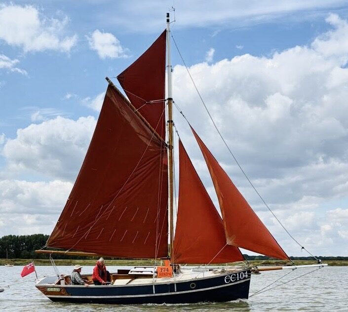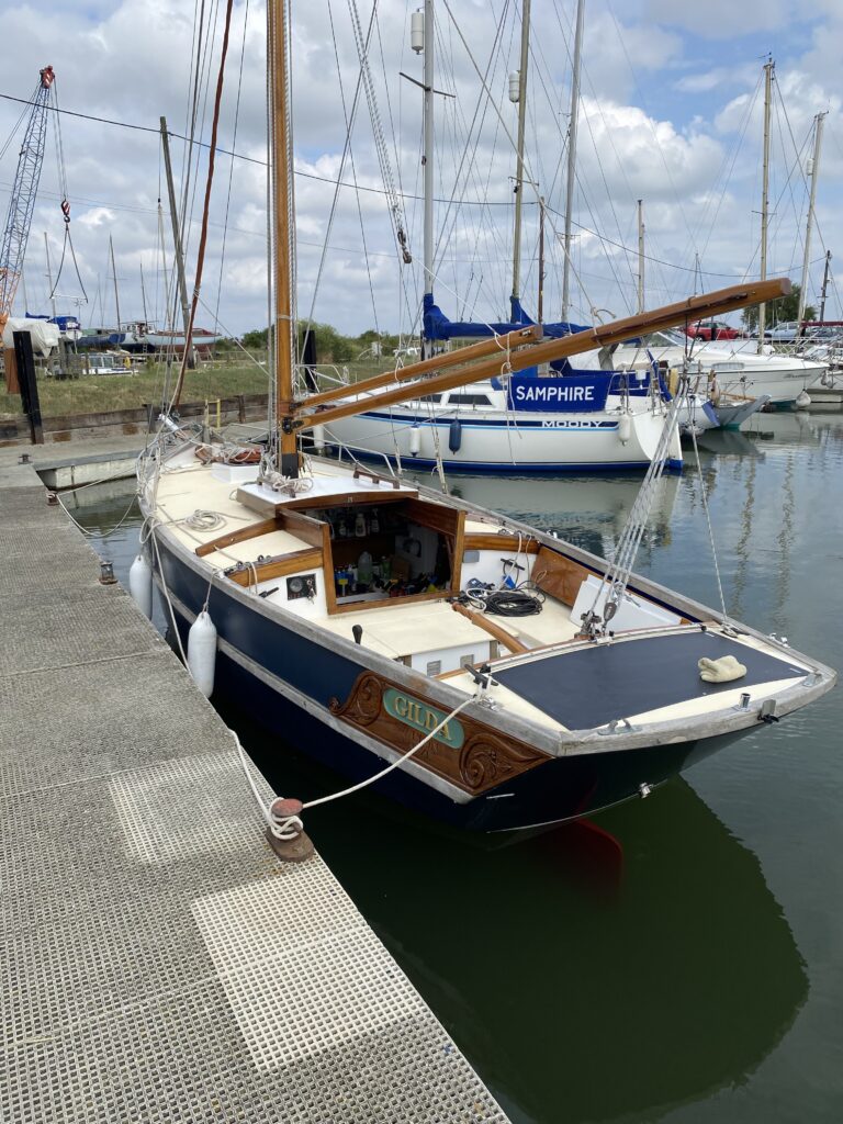 Our featured boat for March is ‘Gilda’, a gaff topsail cutter, produced by Cornish Crabbers at Rock, Wadebridge, Cornwall in 1979 as a kit package. She was designed by Roger Dongray who designed the Crabbers, Shrimpers, Golant Gaffer and Cormorant dinghy some of which we featured last month. Due to poor health her build was contracted to Cantrell & Son, professional shipwrights, at Newhaven. In 1983 she was purchased by Gill and David (thus ‘Gilda’) Stacey and launched for the first time at Maldon. Through good times and bad, and a variety of owners, she has remained on the East Coast exploring its creeks and rivers.