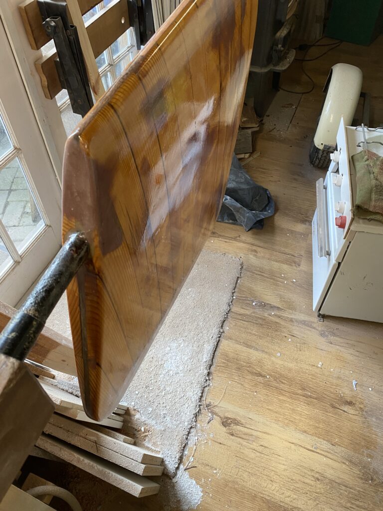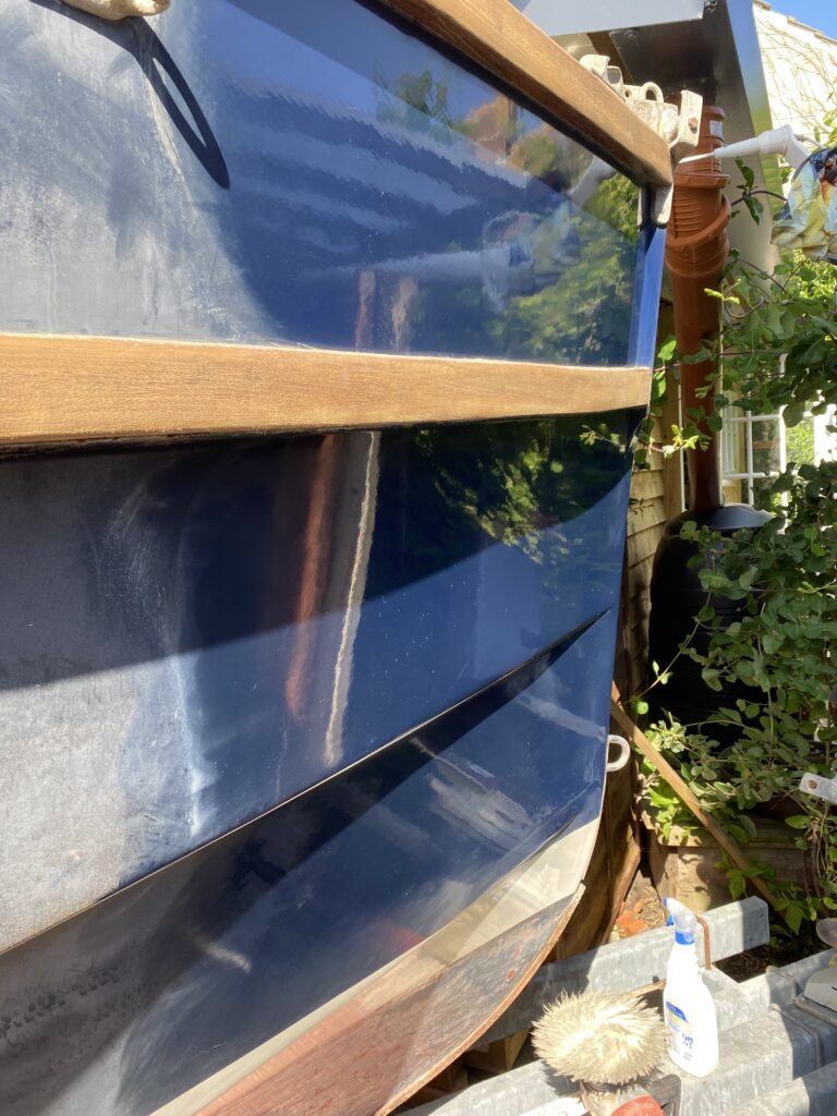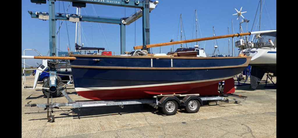 We took the spars home to refurbish over the winter, this included splitting open the length of all seams, scarfing in new wood where required and epoxying them all back together, sanding and 9 coats of varnish. It never ceases to amaze me at how resilient wood can be. The following May, after purchasing a 4-wheel trailer, ‘Gilda’ was finally brought home to Walton on the Naze. I was away as crew, sailing ‘Teasel’ to the Netherlands with Martin Hill, when TSL informed that ‘Gilda’ could be moved. TSL had organised a crane and played a game of chess with boats to access ‘Gilda’. I was very annoyed at having to pay the yard to move their customers’ boats, an unusual situation, but they had us over a barrel. I certainly will not do business with them in the future. Good Old Gaffers, Pete and Clare Thomas offered to help Yvonne with securing and towing ‘Gilda’ home where, on 12 May 2024 and with the help of friends and neighbours, she was pushed towbar forward onto the driveway, fence panel removed and close to the workshop. With the Summer Cruise deadline three months away and concentrating our minds we set to with enthusiasm.