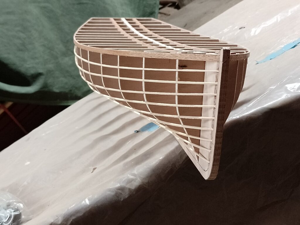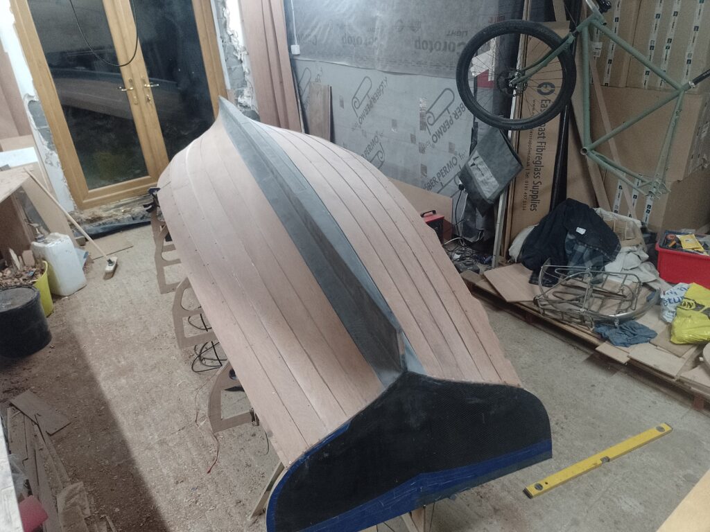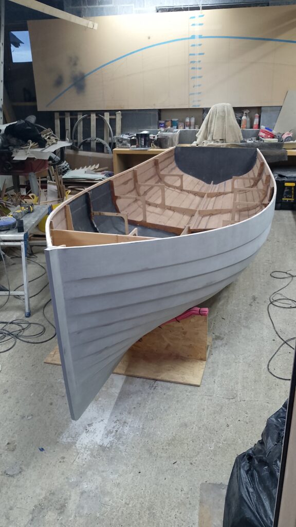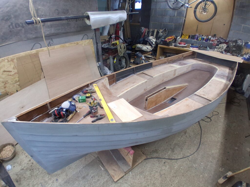 I have no background or training in boat design, but having sailed many and varied boats throughout my life, I’ve developed a pretty good feel for how different hull shapes move through water. I knew it was possible to make a boat that looked like a traditional clinker workboat, but was capable of performance on a par with any modern racing dinghy. Not knowing how to translate this into a two dimensional drawing, I made a series of scale models to refine the shape, before scaling up to a full-size half model, which I used to make the building frames from. The prototype hull is clinker, built in marine plywood, glued with epoxy and reinforced with carbon fibre and fibreglass. I decided to incorporate this juxtaposition of modern materials and traditional design into the aesthetic of the boat, leaving the sheer plank, transom and knees as exposed carbon fibre, contrasted against the oiled oak and sapele gunwales, thwarts and trims. As building a one-off boat is such a huge amount of work, I decided it was worth taking a series of moulds from the prototype hull. Future copies may be produced in GRP. The finished prototype weighs about 170kg, but I think we can get the production boats down to below 150kg, whilst maintaining a very robust and rigid cored-fibreglass hull construction.