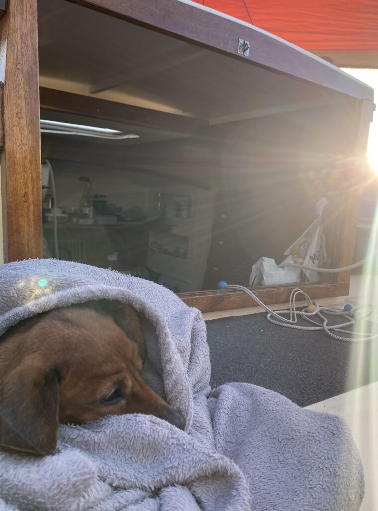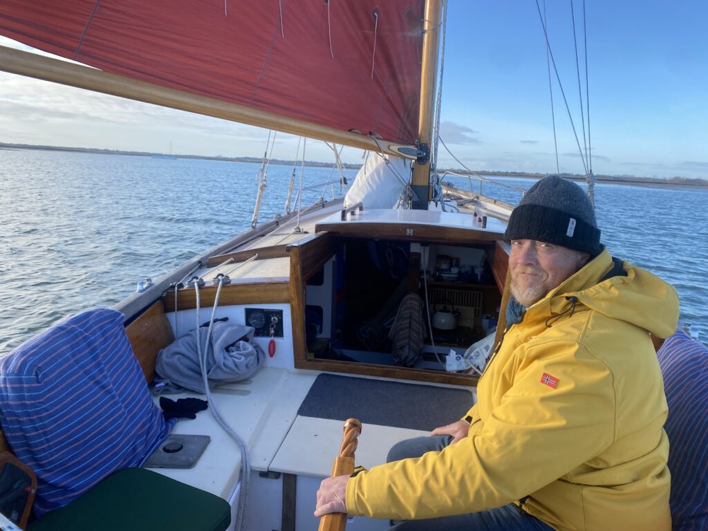 Two years later, on the day before New Years Eve, I woke up and reached out to see the time on my phone. There were WhatsApp messages on the OGA group chat. I noticed Des had offered the opportunity to go for a sail. I missed being on the water over the winter. Among the messages was one from my bank saying I didn’t have enough money in my account for an electric arrears bill. This brought my excitement of possibly going sailing down to a crash. I called my bank. After the call I noticed Des had said he was setting off at 11am. It was now 10am and it would take me an hour to get there. I messaged Des to ask if I could sail with him. He agreed and said he would wait for me. Throwing clothes into a bag I grabbed my dog Lottie and her coat. I realised that in my haste I hadn’t brought any food for Lottie, I jumped into the shop on the way and picked up some ham, jumping back in the truck and driving to Titchmarsh Marina.