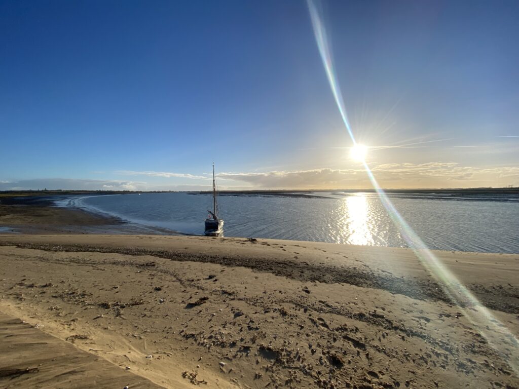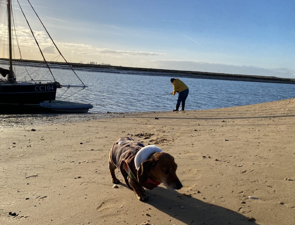 I had always wanted to stop at Stone Point and walk on the sand and Lottie would be happy to run around. Des gently beached ‘Gilda’ on the sandy bank and put the kettle on. This was reminiscent of sailing on the Norfolk Broads where I would often glide into the reeds to hold my boat steady and lower my mast before going under low bridges. Des kindly offered me a hot drink some of his home made bread and to share his lunch. I offered him the honey and mustard ham bought for Lottie! On Stone Point the views were stunning and from a certain angle could be mistaken for some beautiful Mediterranean island. Looking out to sea we could see the jumping of the water as the waves separated, revealing the normally hidden sandbanks. Des said we could almost walk to Harwich. He’d noticed that lately the tides had been unusually low and discovered there had been a recent negative surge to cause this. As we walked Des talked of how some of the local sailors of the older generation would camp for days at Stone Point as young boys, it was regarded as their annual camping holiday with fishing and campfires.