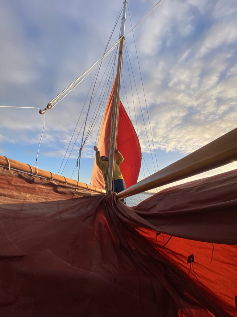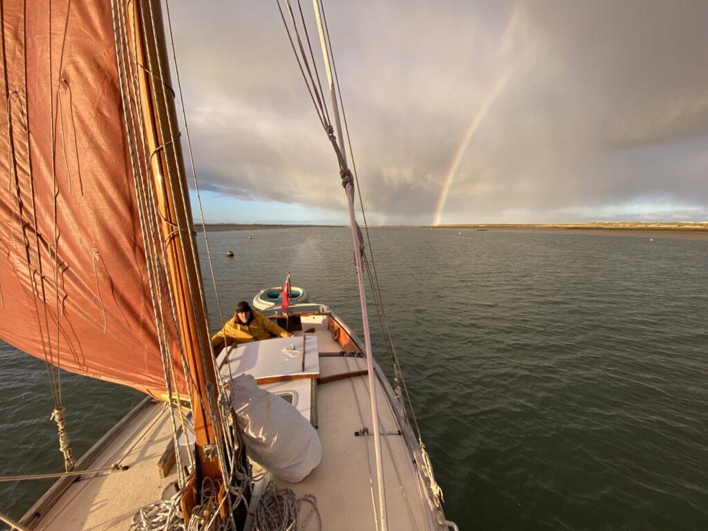 We used the tender to get back onboard and Des took up the anchor, ‘Gilda’ gracefully slipped back into the water and turned to face home. We set sail. Grey and white clouds began to billow out behind us and the wind picked up. I enjoyed setting the sails to goose wing. “There’s a rainbow”, Des said. I turned to see a Turner-style sky and bright rainbow colours appearing below. “It was meant to be,” I said. What more could I have asked for? Beautiful views, nature, sailing, friendship, kindness and generosity; thank you Des and ‘Gilda’ for making my Christmas and New Year a memorable one.
